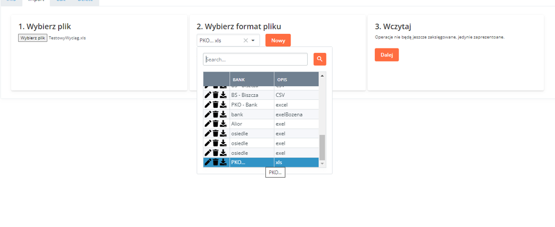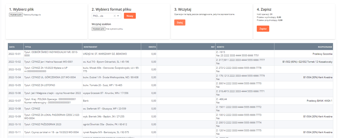 - Import - zaczytujemy wcześniej wygenerowany plik bankowy.