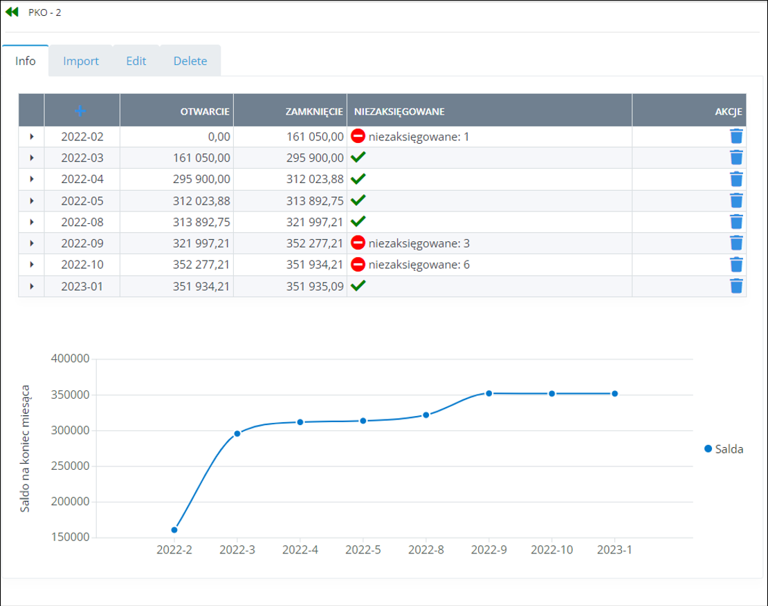 Delete - w tej zakładce usuniemy całkowicie konto bankowe ze wszystkimi okresami rozliczeniowymi.