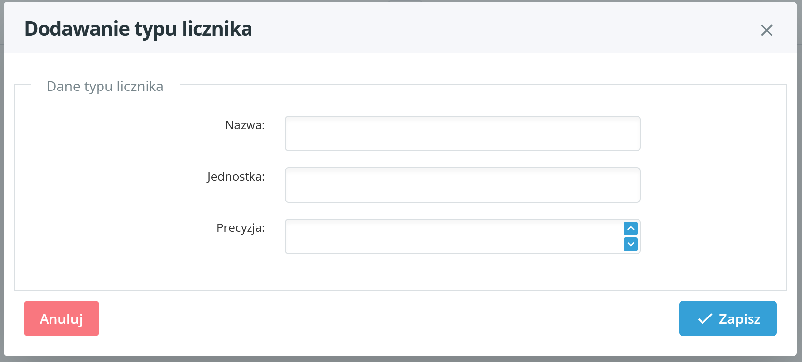 W okienku Dodawanie typu licznika wpisujemy nazwę, jednostkę i precyzję (ilość miejsc po przecinku przy pomiarze).