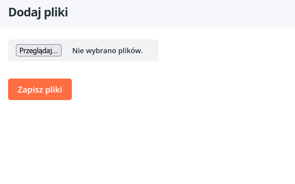 "Dodaj pliki" - po kliknięciu trzeba wybrać plik z komputera (kliknij "wybierz pliki", znajdź na komputerze plik, który chcesz przesłać, kliknij "zapisz pliki".