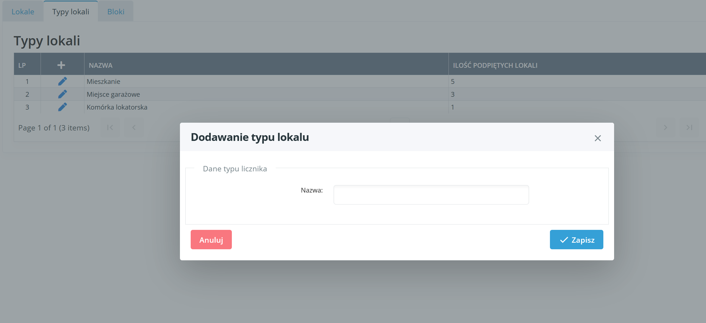 W zakładce "Typy lokali" możemy dodać typy lokali, które znajdują się na naszym osiedlu. Czasami na osiedlach są nie tylko mieszkania, ale też na przykład komórki lokatorskie lub garaże, które mogą być rozliczane w inny sposób niż mieszkania, dlatego należy tutaj je dodać, by móc je rozróżniać.