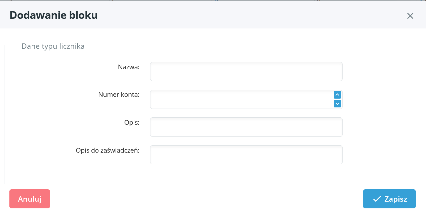 Aby dodać nowy blok, należy kliknąć + znajdujący się w tabeli i wypełnić wszystkie potrzebne nam pola. Następnie klikamy Zapisz i nasz blok zostaje dodany do tabeli bloków istniejących na naszym osiedlu.