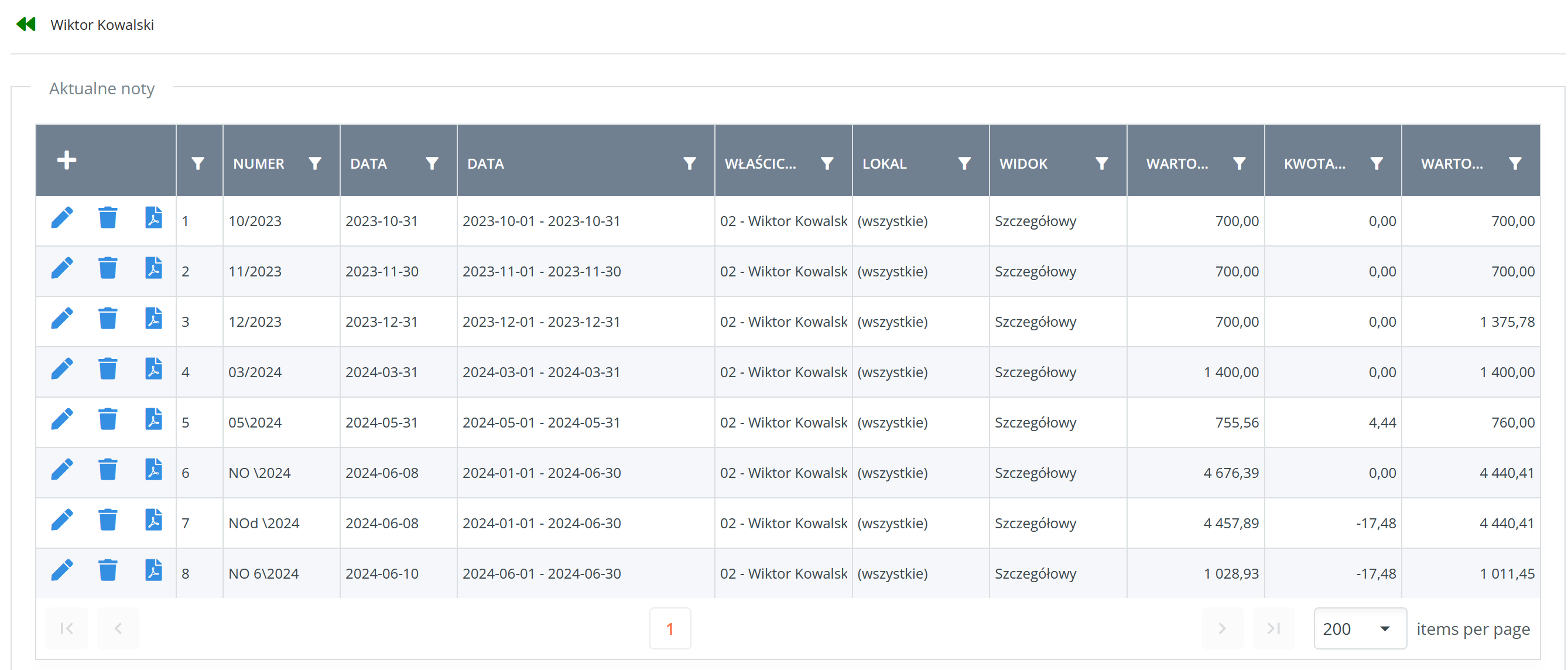 W tej zakładce widzimy wszystkie noty z naliczeniami w danym miesiącu.