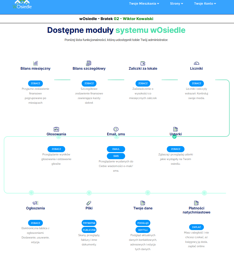 Portal wOsiedle.pl pozwala na logowanie się zarządców i księgowych (https://wosiedle.pl/login), aby mogli wprowadzać dane i zarządzać systemem.