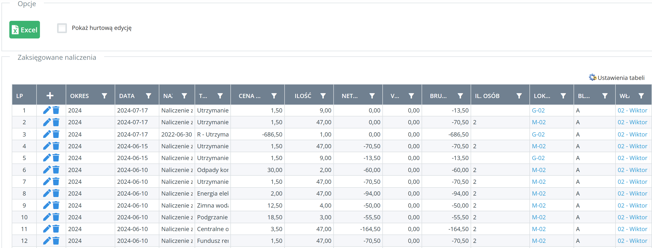 W tej zakładce mamy podgląd na wszelkie naliczenia wykonane na danego Właściciela.