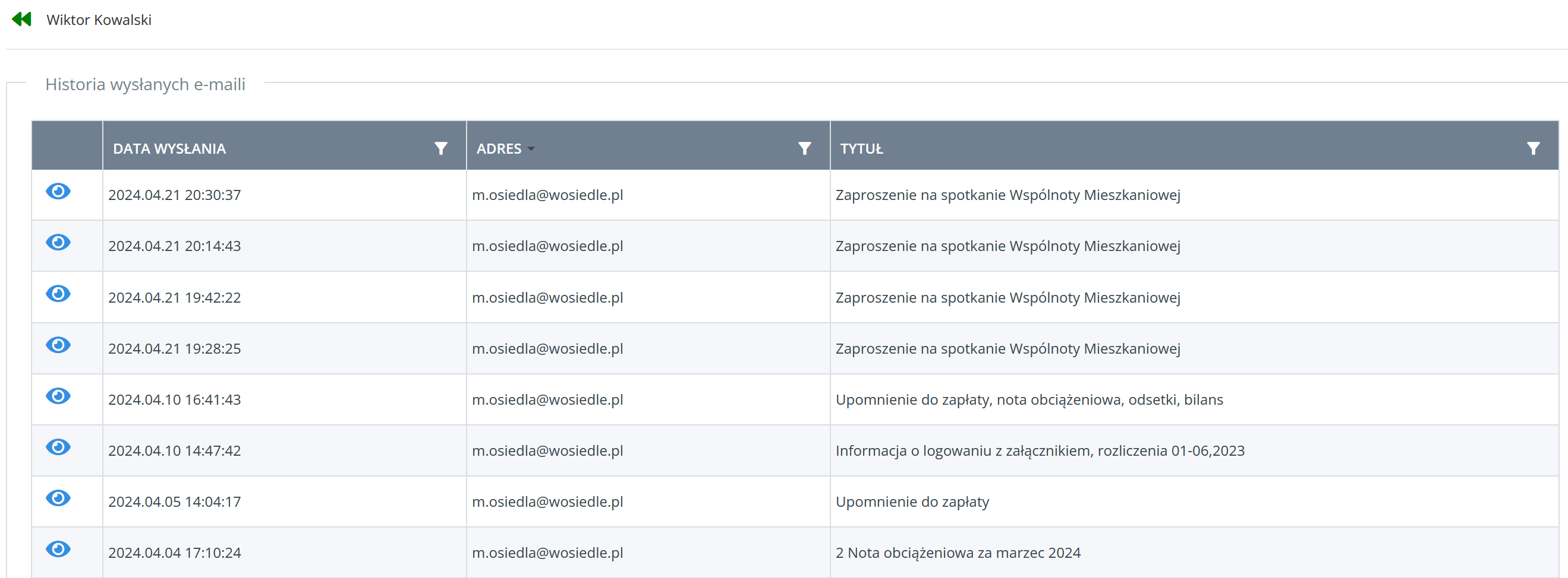 W tej zakładce mamy podgląd na wszystkie e-maile, z które były wysłane do Właściciela. Klikając na "oko" mamy podgląd na treść zawartą w e-mailu.