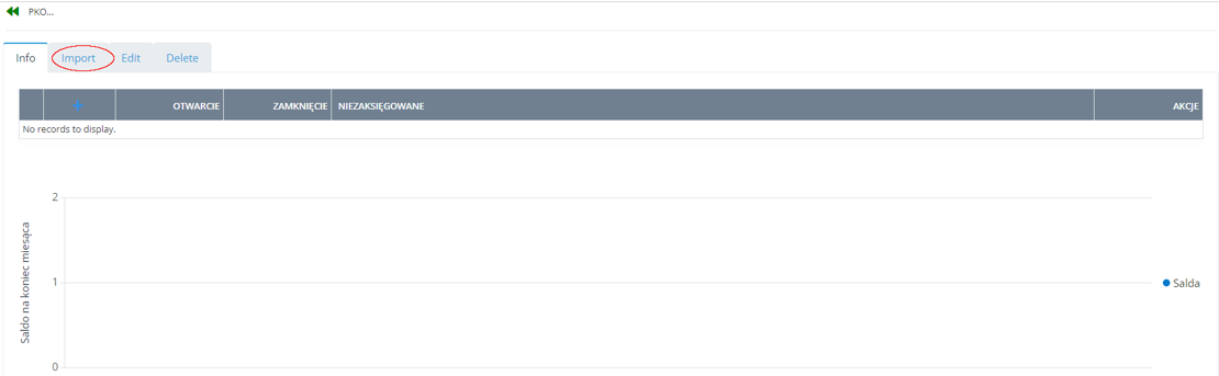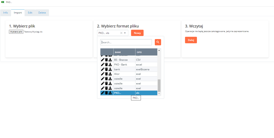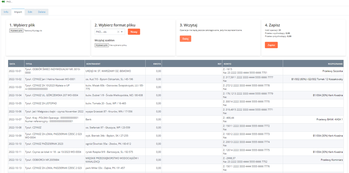 - Import - zaczytujemy wcześniej wygenerowany plik bankowy.