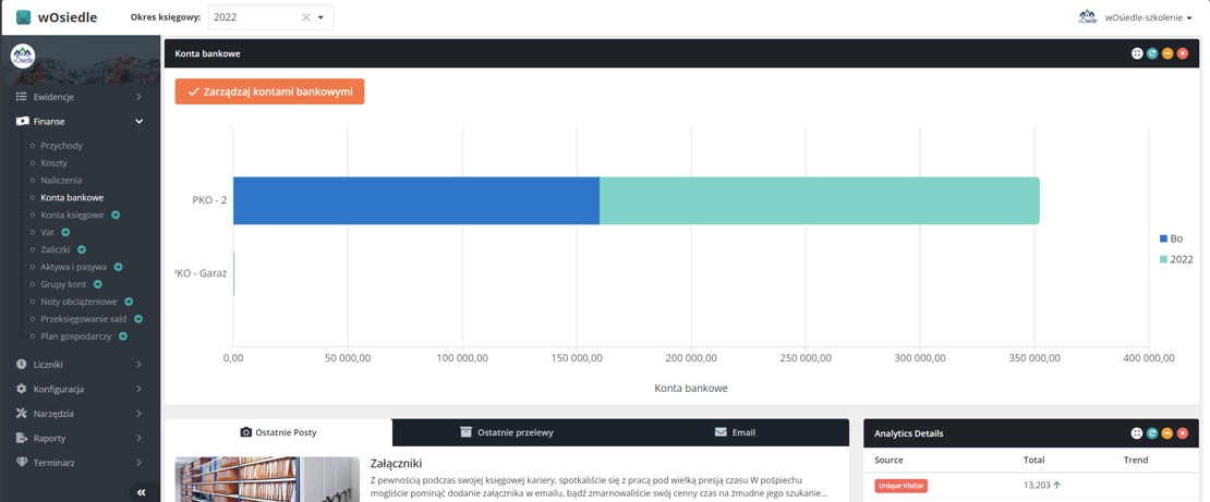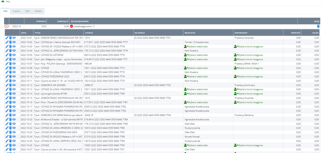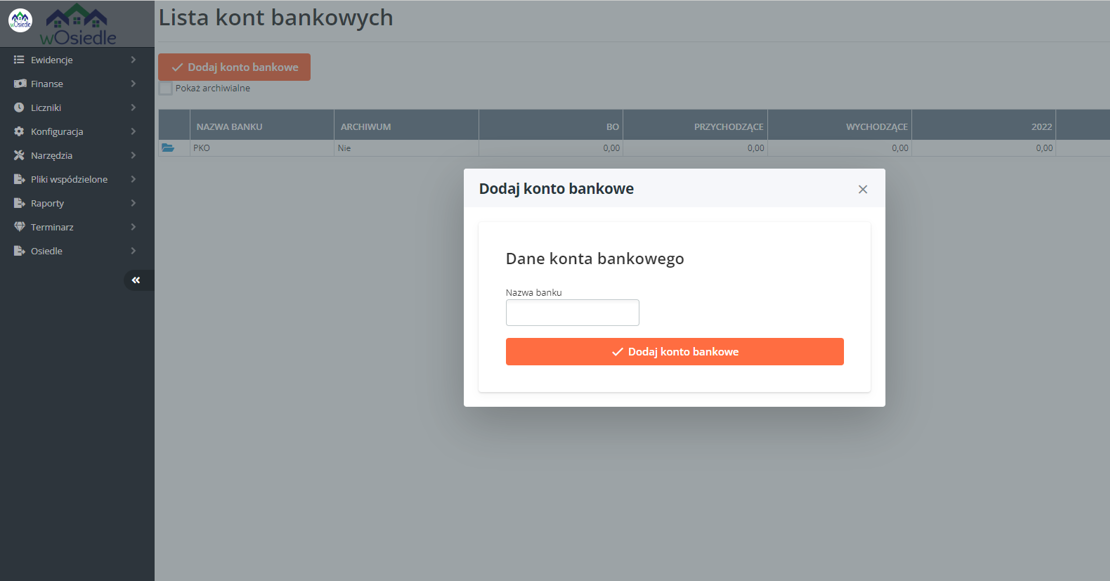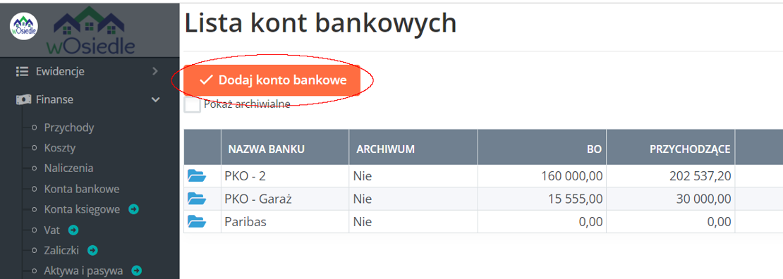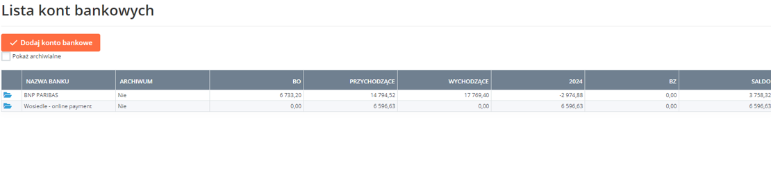 Konta bankowe to odzwierciedlenie realnych kont bankowych z numerem rachunku, które posiada Osiedle.