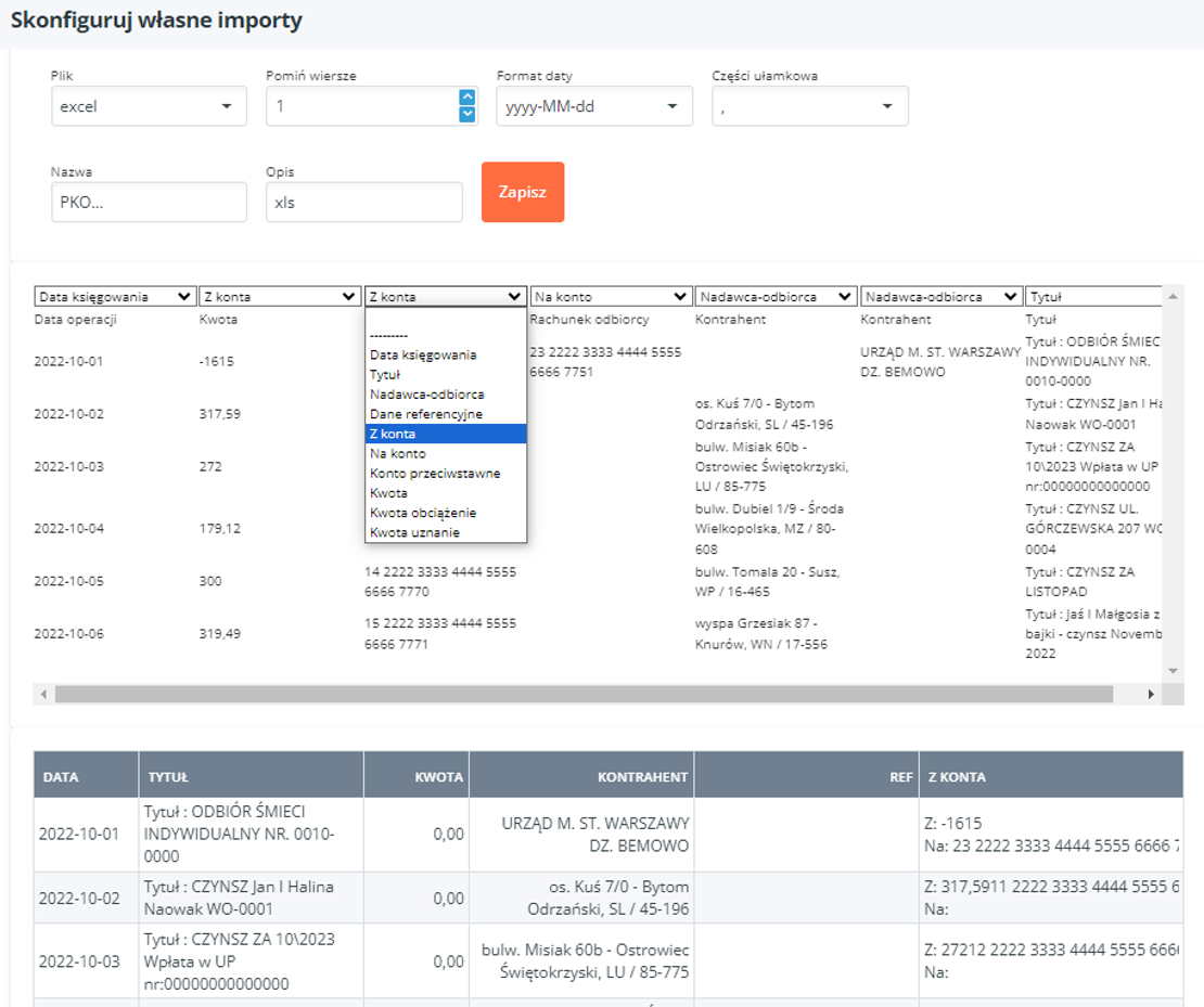 nazwy kolumn. W tym przypadku mamy plik bankowy.xls - Pod ustawieniami mamy podgląd, jak zaczyta się plik bankowy do programu wOsiedle.pl
