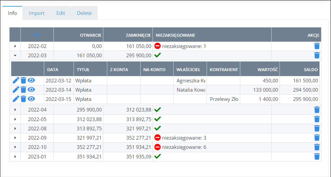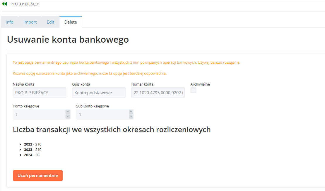Delete - w tej zakładce usuniemy całkowicie konto bankowe ze wszystkimi okresami rozliczeniowymi.