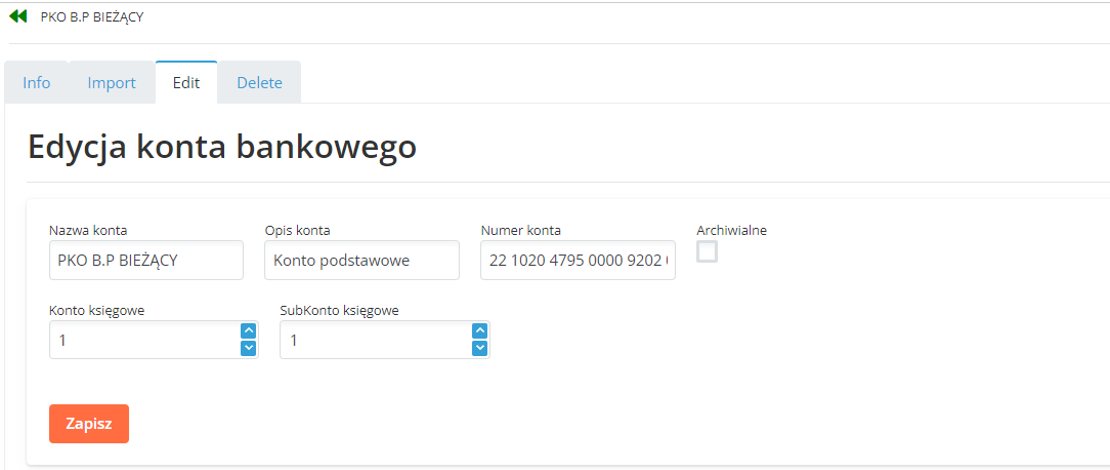 - Edit - mamy możliwość zmiany nazwy banku, opisu konta, numeru konta.