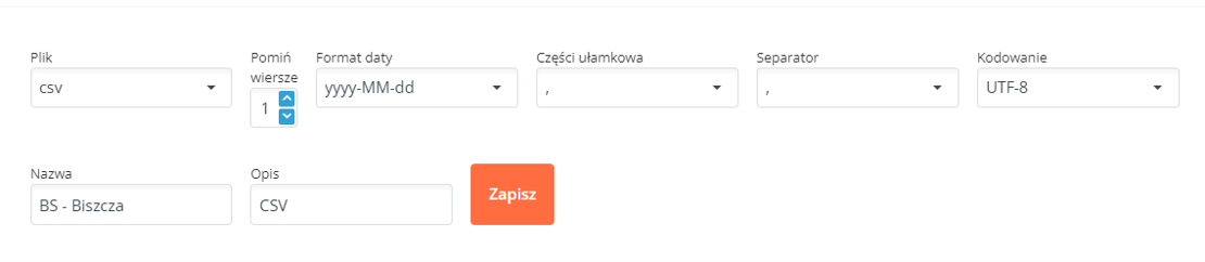 Import->Wybierz plik. Jeśli mamy na liście utworzony szablon to pomijamy 2 krok ->(2. Wybierz format pliku) Jeśli nie mamy szablonu - personalizujemy własny. - Klikamy Krok 2.