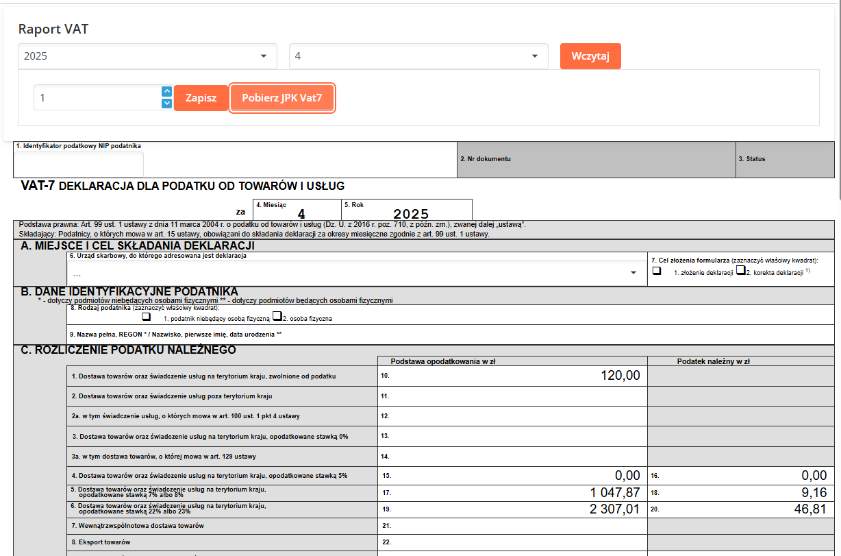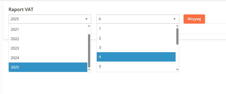 "Rok"i"Miesiąc"dla którego chcesz wygenerować raport VAT. Upewnij się, że wybrany okres jest zgodny z Twoimi potrzebami księgowymi.