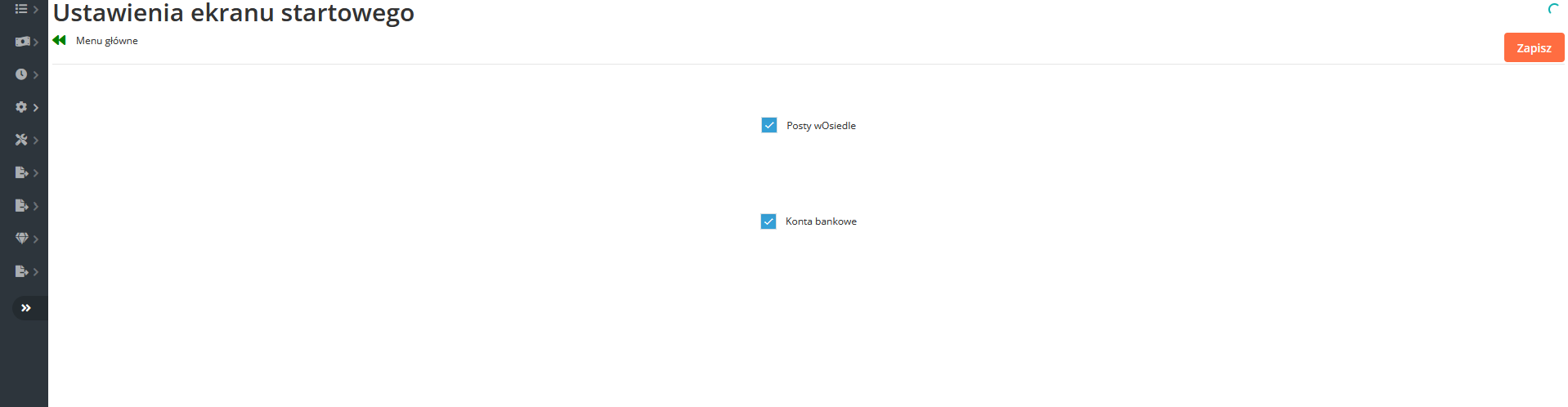 Mamy tutaj możliwość wybrania, czy chcemy, aby na ekranie startowym ukazywały nam się posty wOsiedle oraz zakładka kont bankowych. Jeśli mamy potrzebę zrezygnować z oglądania któregoś z nich, wystarczy odznaczyć okienko przy nim się znajdujące.