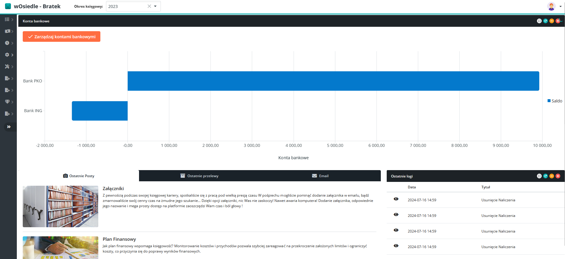 Systemowo na ekranie startowym znajduje się zakładka podglądu kategorii kont bankowych (umożliwiająca pomarańczowym przyciskiem przejście do zarządzania kontami bankowymi oraz dająca podgląd na salda naszych kont bankowych), poniżej podsumowanie okresu rozliczeniowego, zakładka ostatnie posty (ukazująca ostatnie posty wstawiane na naszą stronę), zakładka ostatnie przelewy (ukazująca ostatnie przelewy wykonane na naszym koncie), zakładka email (ukazująca kilka ostatnich emaili wysłanych przez nas) oraz zakładka ostatnie logi, która ukazuje ostatnie akcje wykonane przez nas na naszym osiedlu.
