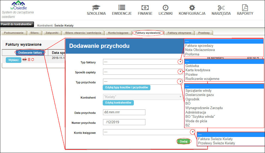 W zakładce "faktury wystawione", dodajemy faktury wystawione dla kontrahenta. Dodawanie przychodu dla osiedla.