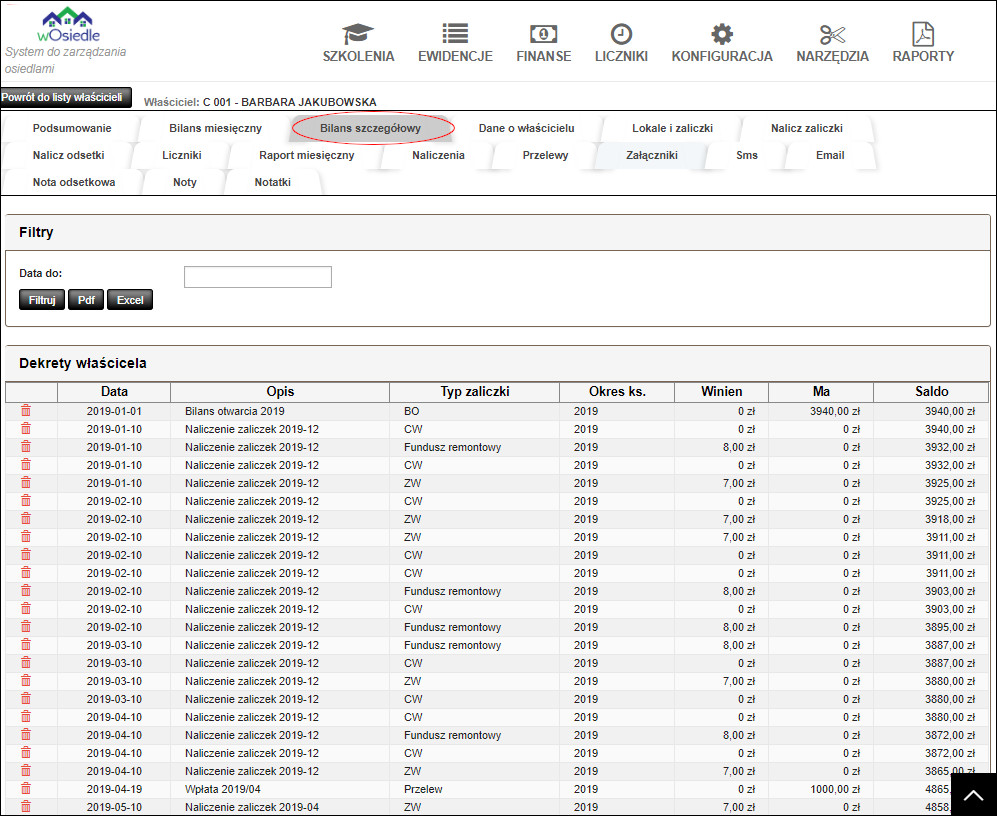 Klikając na PDF mamy możliwość wygenerowania pdf-a z bilansem, szczegółowym, miesiecznym, upomnienia czy wysokość zaliczek.