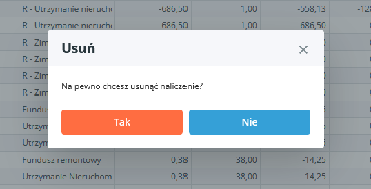 Obok niebieskiego ołówka znajduje się jeszcze niebieski kosz na śmieci. Kliknięcie go spowoduje wyskoczenie okienka upewniającego się o chęć usunięcia danego naliczenia. Wystarczy kliknąć Tak a naliczenie zostanie usunięte.