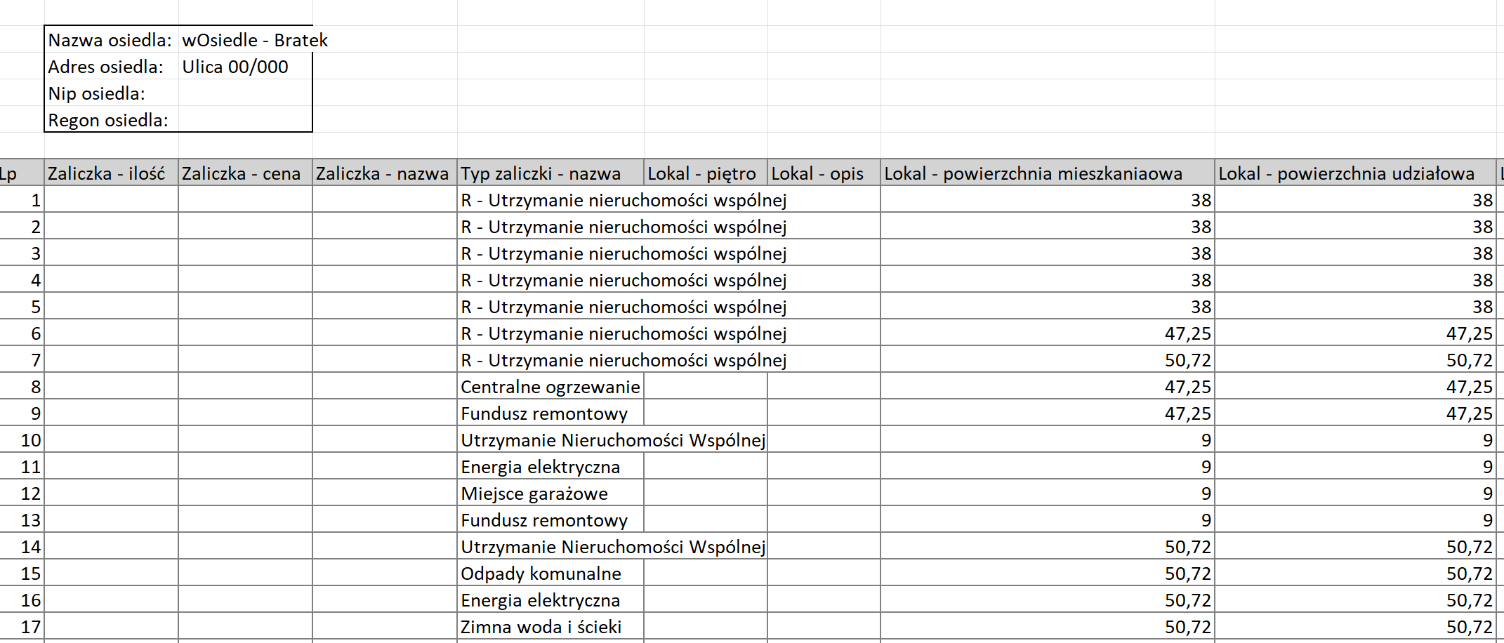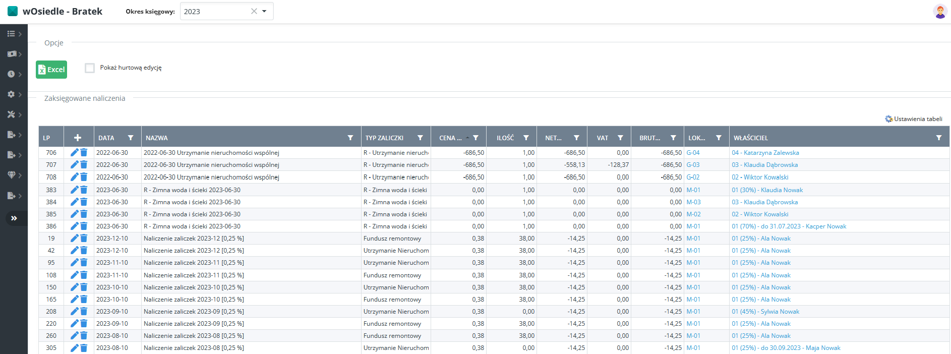 Po wejściu w kategorię Naliczenia na samym początku widoczny jest zielony przycisk z napisem Excel , który po kliknięciu generuje plik excel w szystkimi informacjami o wszystkich naliczeniach, jakie istnieją w naszym osiedlu.