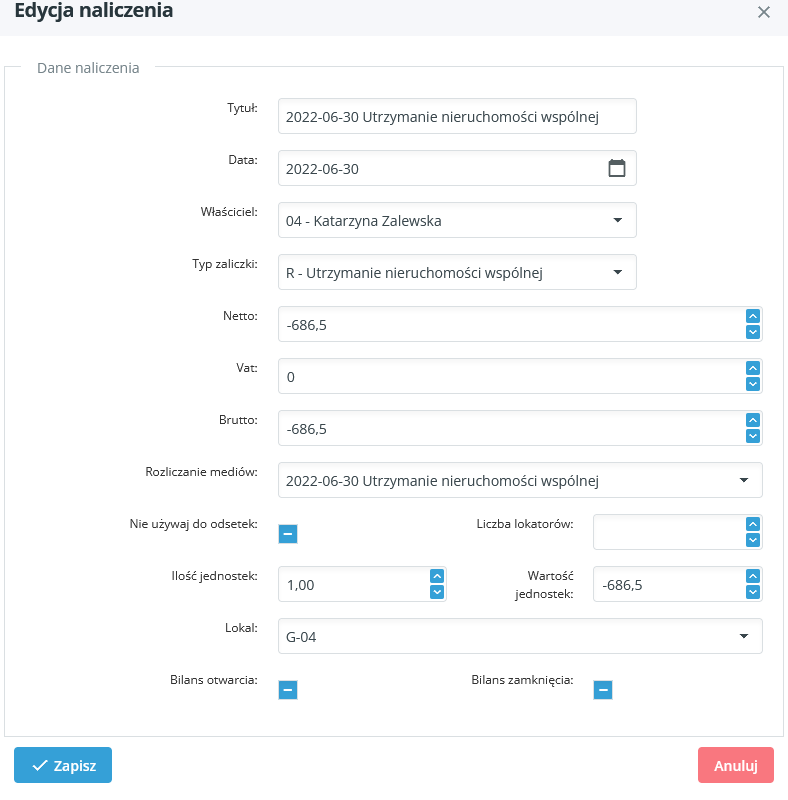 Podczas edycji pojedynczego naliczenia mamy możliwość edytować: