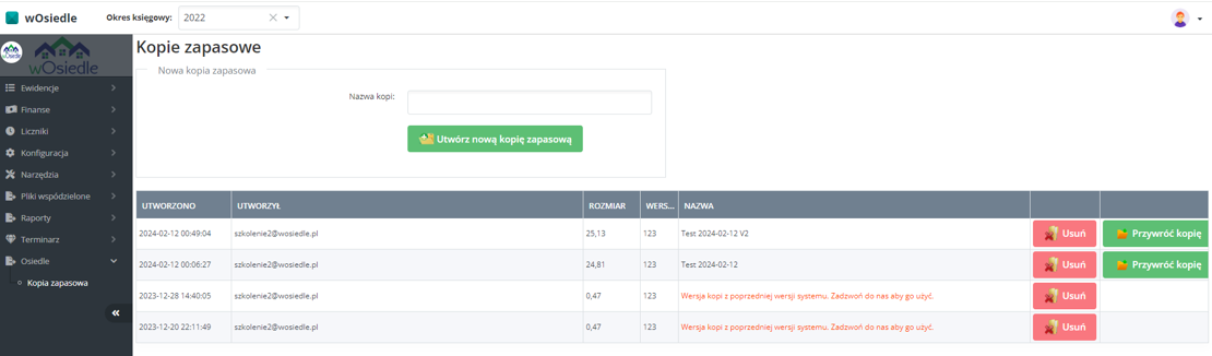 W kolumnie Nazwa mamy tytuł oraz informację z której wersji programu wOsiedle jest zrobiona kopia.